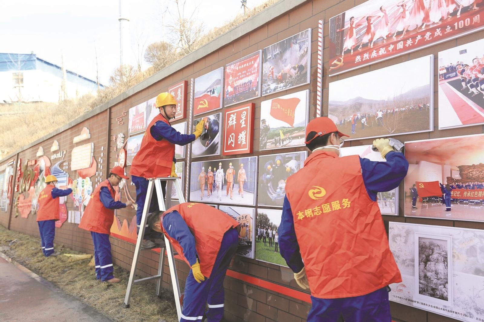 图为该厂党员志愿者们仔细擦拭文化墙上的每一块展板。