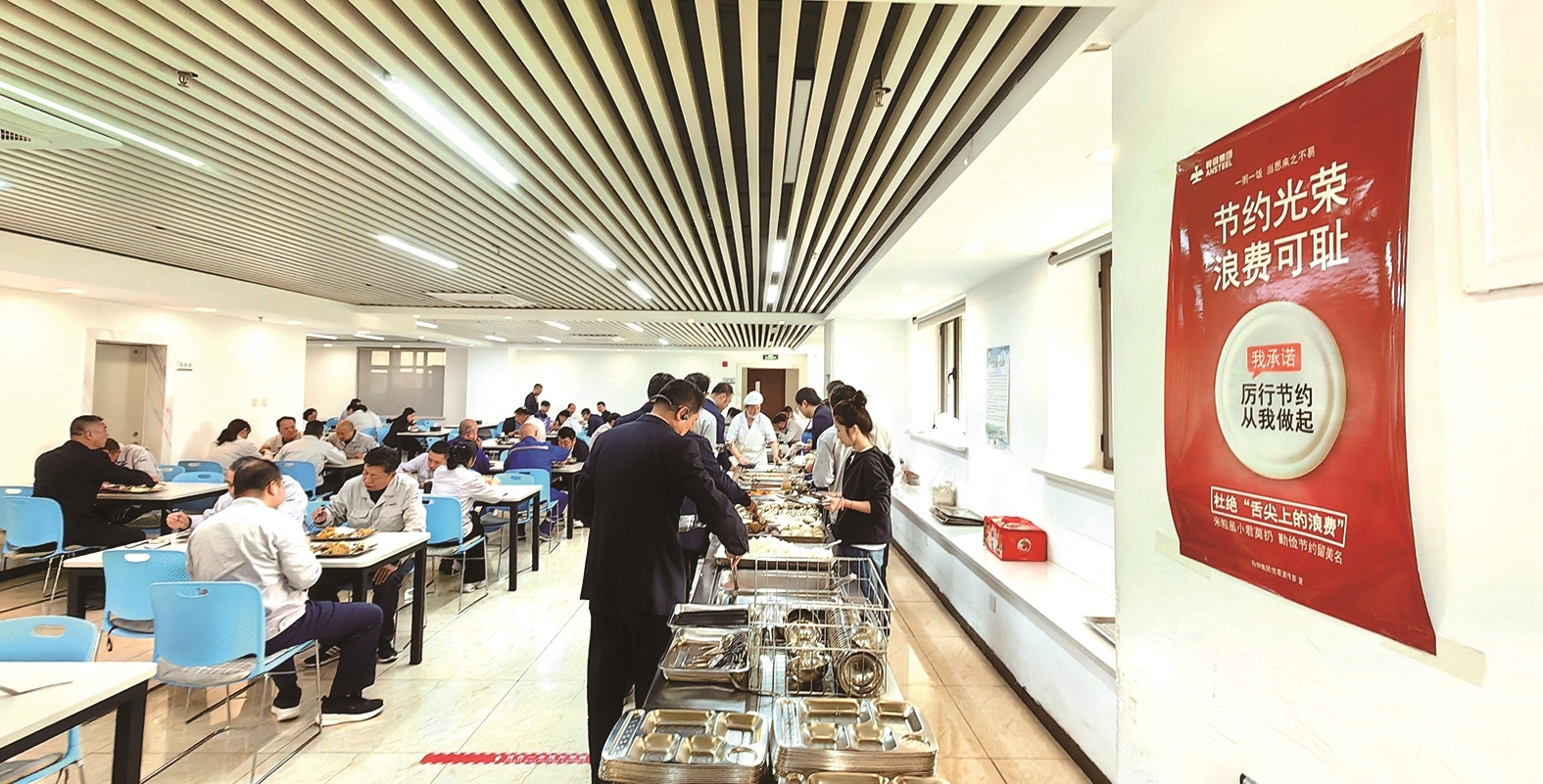 ①攀钢在食堂醒目位置设置提示牌、宣传标语等,营造“珍惜粮食、杜绝浪费”良好氛围。