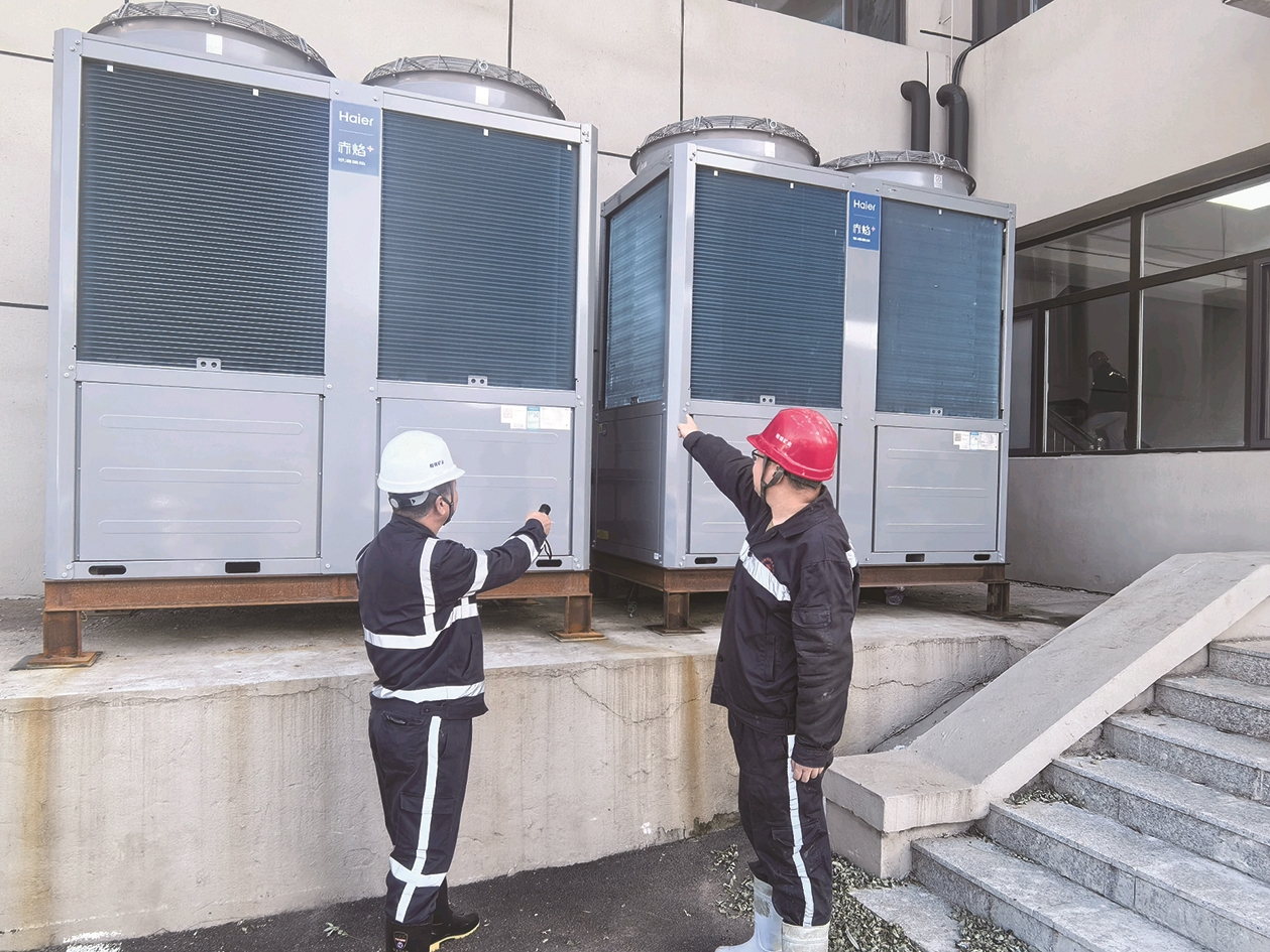 鞍钢矿业弓长岭井下矿职工在检查空气能采暖设备。日前,该矿在集控中心、综合办公楼安装了5台48kw空气能采暖设备。该设备可自行设定温度、风速,具有噪声低、运行效率高等特点,在改善职工工作环境的同时可有效降低能源消耗。本报记者 刘金宇 文 通讯员 谢忠刚 摄