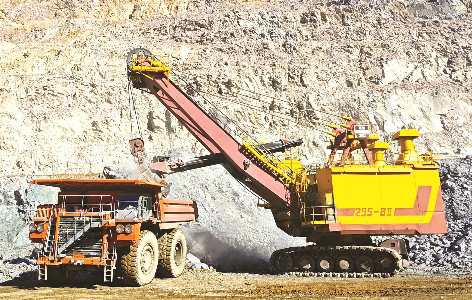 鞍钢矿业齐大山铁矿露天采场上,电铲与矿用卡车密切配合作业。