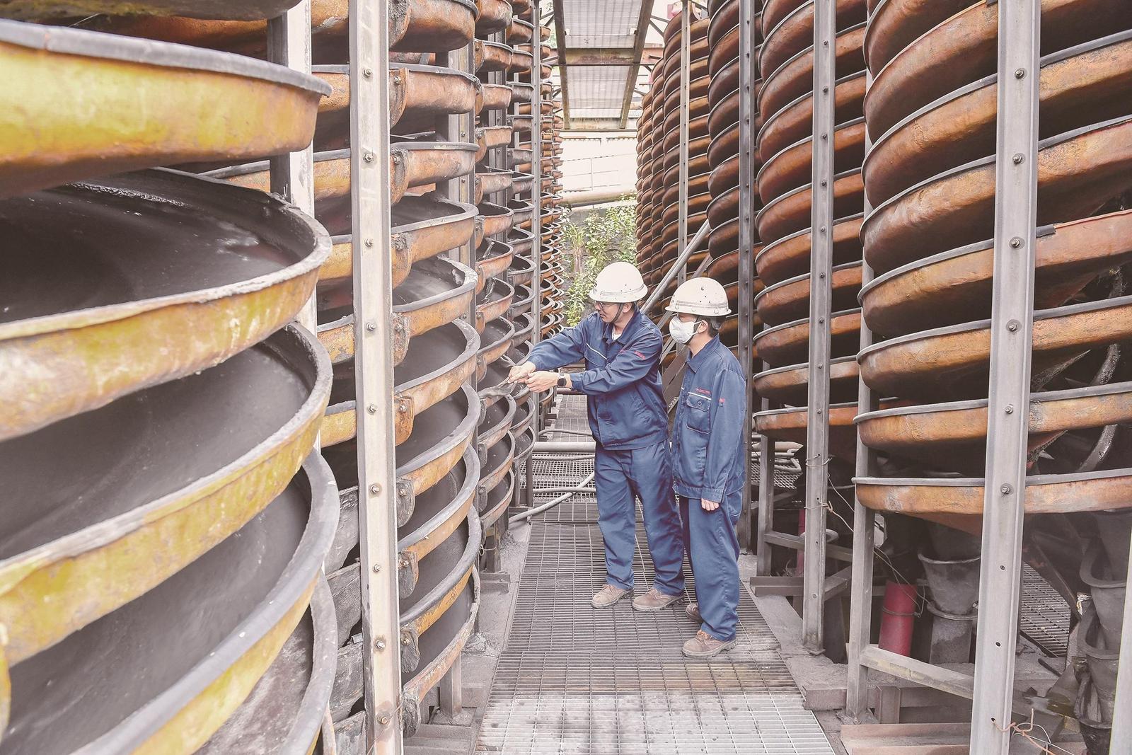 攀钢矿业新白马公司选钛作业区职工正在检查重选螺旋截取器。